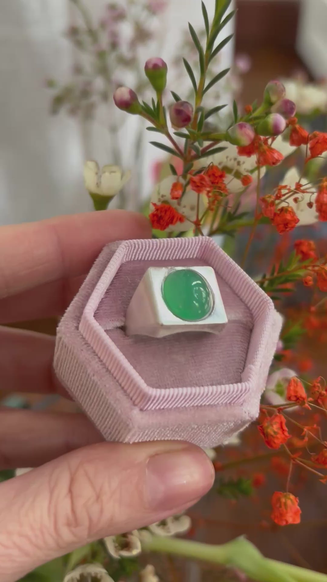 Uno splendido cabochon di crisoprasio è il vero protagonista di questo anello in argento 925.