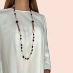 Questa collana lunga è un incontro armonioso di forme e materiali preziosi.